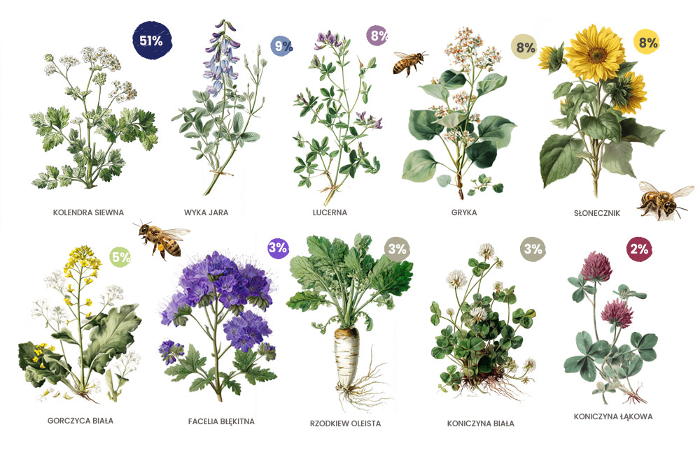 • Kolendra siewna (51%) zapewnia intensywny zapach i obfity nektar.