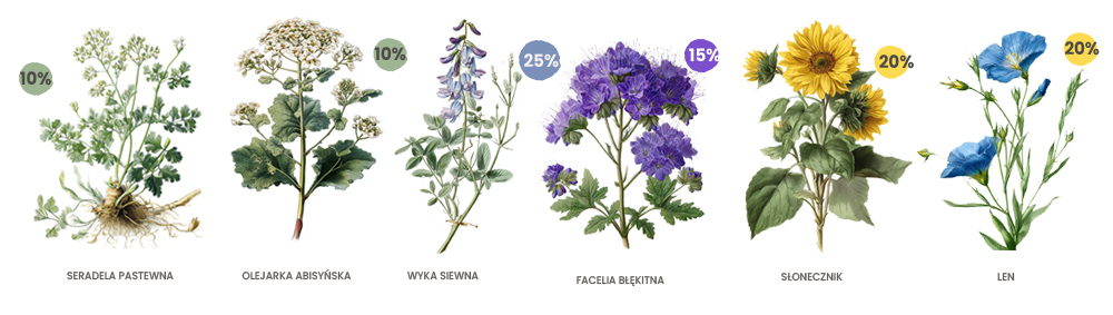 Mieszanka MP-R to prawdziwa pomoc dla gleby, która potrzebuje troski i regeneracji. To kompozycja starannie dobranych roślin, które zadbają o Twoje pole, poprawiając strukturę gleby i dostarczając jej niezbędnych składników odżywczych. Składa się z takich roślin jak seradela, olejarka abisyńska, wyka jara, facelia, słonecznik i len – każda z nich pełni swoją rolę w poprawie jakości gleby i przygotowuje ją do przyszłych plonów.