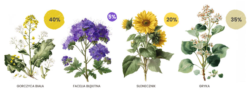 - Regeneracja gleby: Rośliny w mieszance MP10 poprawiają żyzność gleby, zwiększają jej próchnicę i wspierają naturalne procesy zdrowotne.