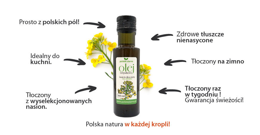 • Najlepsze polskie ziarno – Tłoczymy olej wyłącznie z wyselekcjonowanych nasion rzepaku bezerukowego, co gwarantuje wyjątkową jakość produktu.